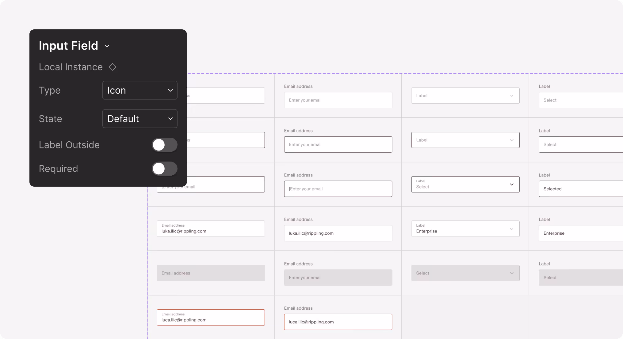Documenting all possible input field variants for developers. Enabling designers to easily switch between them using component properties when iterating in other molecules such as forms.